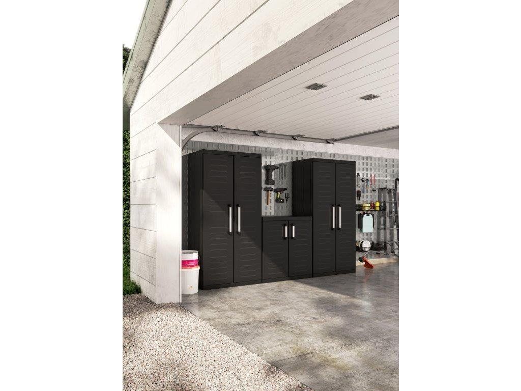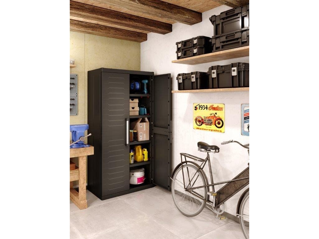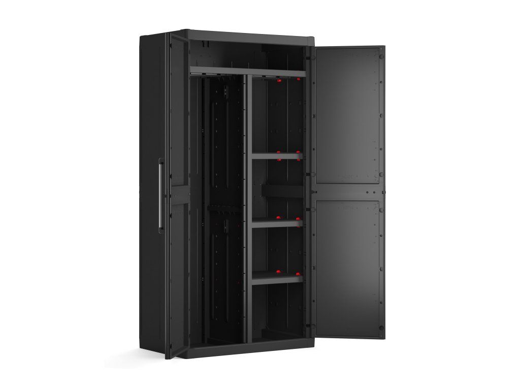 Skříň obsahuje celkem 4 přídavné police - každá s výraznou nosností až 15 kg, které přijdou vhod pro výrazně těžší předměty všeho druhu. Lze ji tedy využít pro skladování dílenského nářadí či zahradnických potřeb, kdy přijde vhod pro uložení náčiní s dlouhou násadou, které by se jinam nevešlo. Díky svému provedení v neutrální černé barvě zapadne do každého prostoru bez ohledu na jeho konceptuální styl.