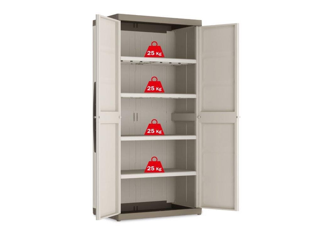 Skříň obsahuje celkem 4 přídavné police – každá s výraznou nosností až 25 kg, které přijdou vhod pro výrazně těžší předměty všeho druhu. Lze ji tedy využít pro skladování dílenského nářadí či zahradnických potřeb, kdy přijde vhod pro uložení náčiní s dlouhou násadou, které by se jinam nevešlo. Díky svému provedení v univerzální béžové barvě zapadne do každého prostoru bez ohledu na jeho konceptuální styl.