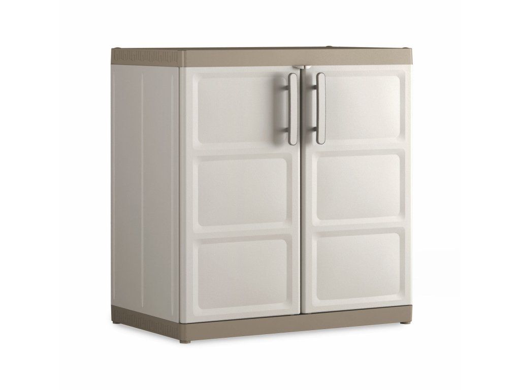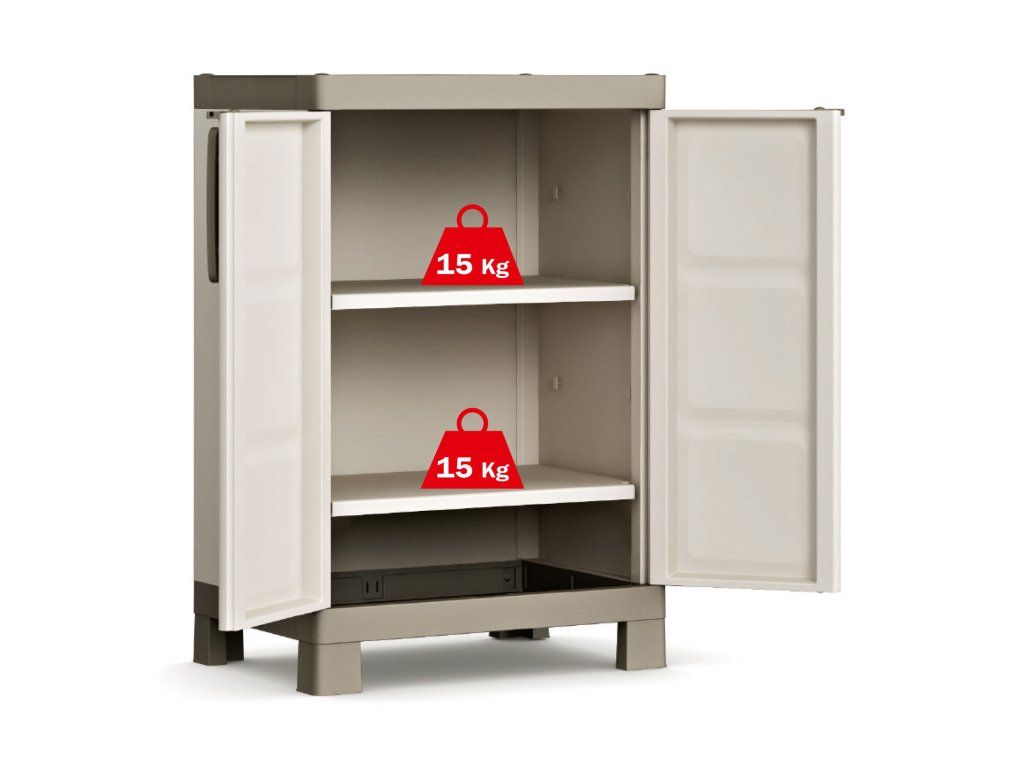 Skříň obsahuje celkem 2 přídavné police - každá s výraznou nosností až 25 kg, které přijdou vhod pro výrazně těžší předměty všeho druhu. Lze ji tedy využít pro skladování dílenského nářadí či zahradnických potřeb, kdy přijde vhod pro uložení náčiní s dlouhou násadou, které by se jinam nevešlo. Díky svému provedení v univerzální béžové barvě zapadne do každého prostoru bez ohledu na jeho konceptuální styl.