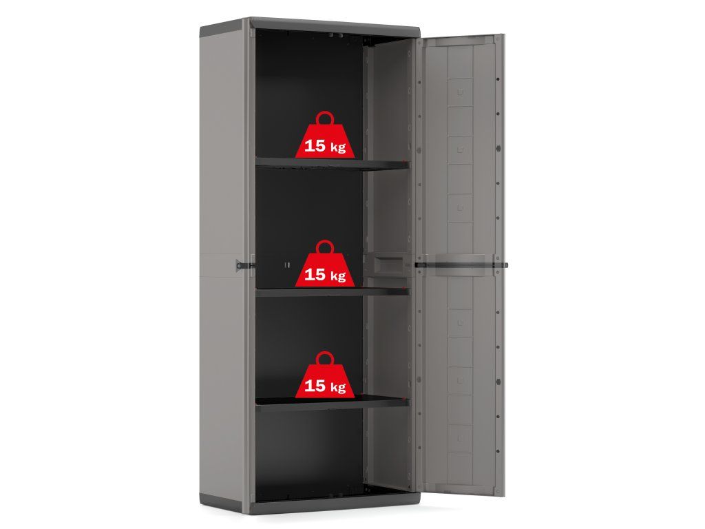 Hledáte odolnou, lehkou a snadno sestavitelnou skříň? Keter Jolly High italské výroby vás potěší snadnou montáží bez nářadí, možností uzamčení visacím zámkem a nastavitelnými policemi, které unesou až 15 kg každá. Plastová skříň Keter Jolly High je praktické úložné řešení do dílny, sklepa i domácnosti.