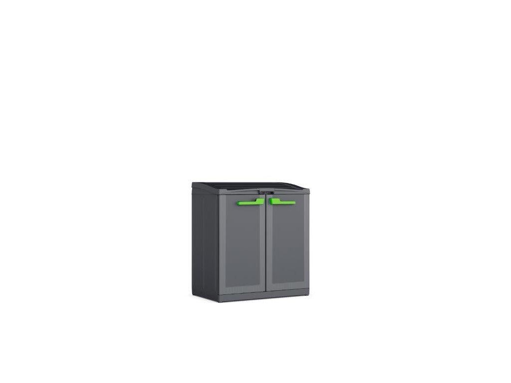 Skříň Keter Moby Compact Store umožňuje přehledné třídění až tří druhů odpadu. Každá komora pojme standardní pytel o objemu 110 litrů. Horní víko slouží k vhazování, čelní dveře umožní snadný přístup k plným pytlům. Box se hodí nejen pro papír, plasty a sklo, ale také pro biologický nebo komunální odpad.