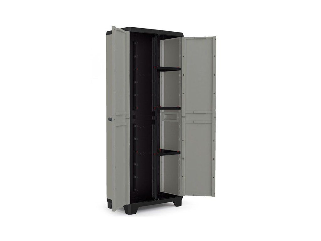 Skříň obsahuje celkem 3 přídavné police - každá s výraznou nosností až 10 kg, které přijdou vhod pro výrazně těžší předměty všeho druhu. Lze ji tedy využít pro skladování dílenského nářadí či zahradnických potřeb, kdy přijde vhod pro uložení náčiní s dlouhou násadou, které by se jinam nevešlo. Díky svému provedení v univerzální šedé barvě zapadne do každého prostoru bez ohledu na jeho konceptuální styl.