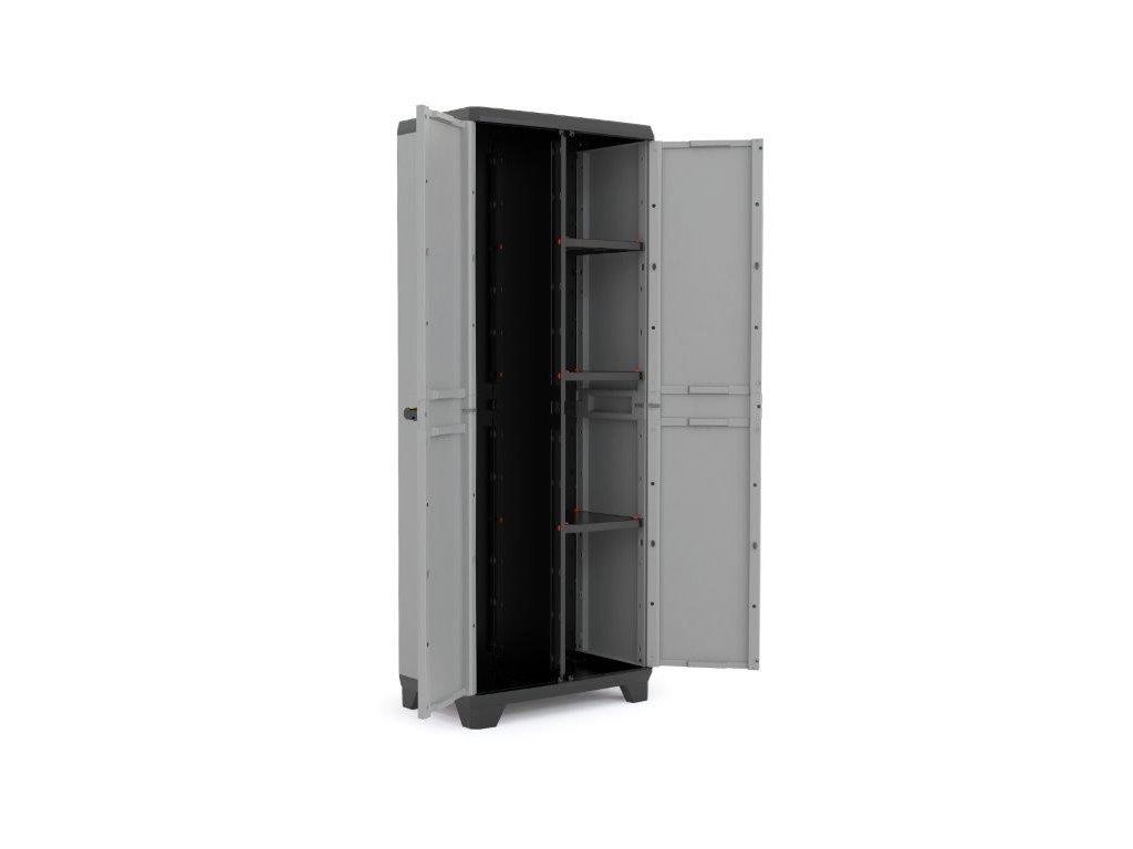 Skříň je vyrobena z odolného plastu, který je nenáročný na údržbu a dobře odolává vlhkosti. Díky nastavitelným nohám snadno vyrovnáte skříň i na nerovném povrchu. Bezpečné uzavření zajistí očko pro připevnění visacího zámku, takže uložené vybavení bude v bezpečí.
