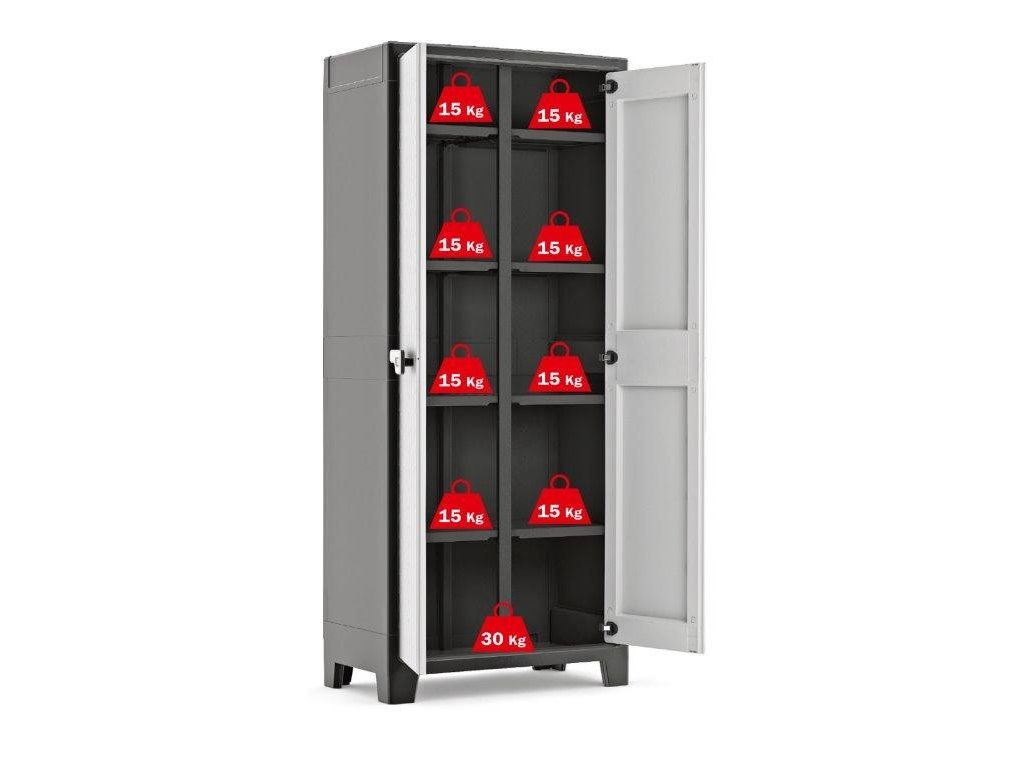 Skříň obsahuje celkem 8 přídavných polic – každá s výraznou nosností až 15 kg. Hodí se tedy pro skladování i výrazně těžších předmětů. Můžete využít také její zesílené dno, které unese dohromady 30 kg. Uskladněte do ní dílenské nářadí, zahradnické potřeby, pomůcky a prostředky pro úklid či praní nebo na poličky vyskládejte zavařeniny (marmelády, kompoty, pyré). Výšku poliček si navíc zvolíte podle velikosti uložených předmětů. Nebo je na jedné straně sundejte úplně a vytvořte prostor pro náčiní s dlouhou násadou, jako je například koště.