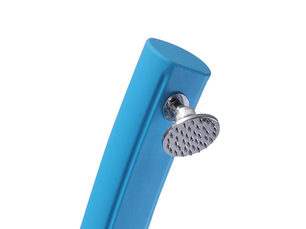 Elegantní solární sprcha v modré barvě, objem zásobníku 25 l, výška 215 cm, sprchovací hlavice o průměru 7 cm, kohoutek na oplach nohou, hmotnost 9 kg. Vyrobena z PVC odolného vůči UV záření. Designové zahnutí sprchy, které podtrhuje její minimalistický vzhled. Hadicová rychlospojka a montážní šrouby součástí balení.