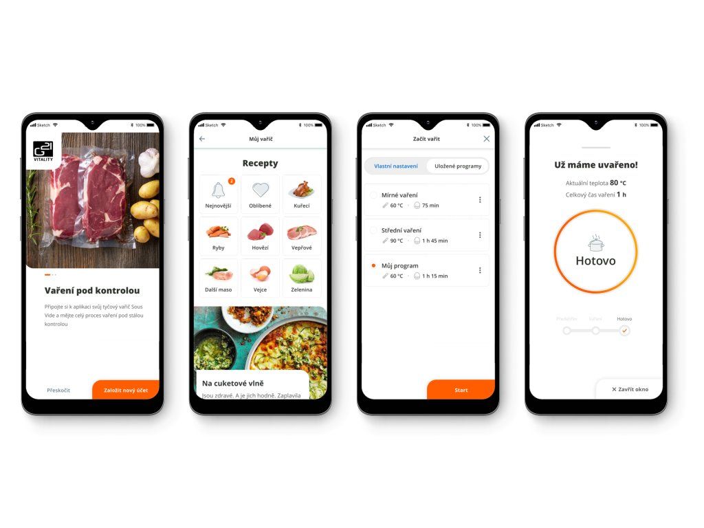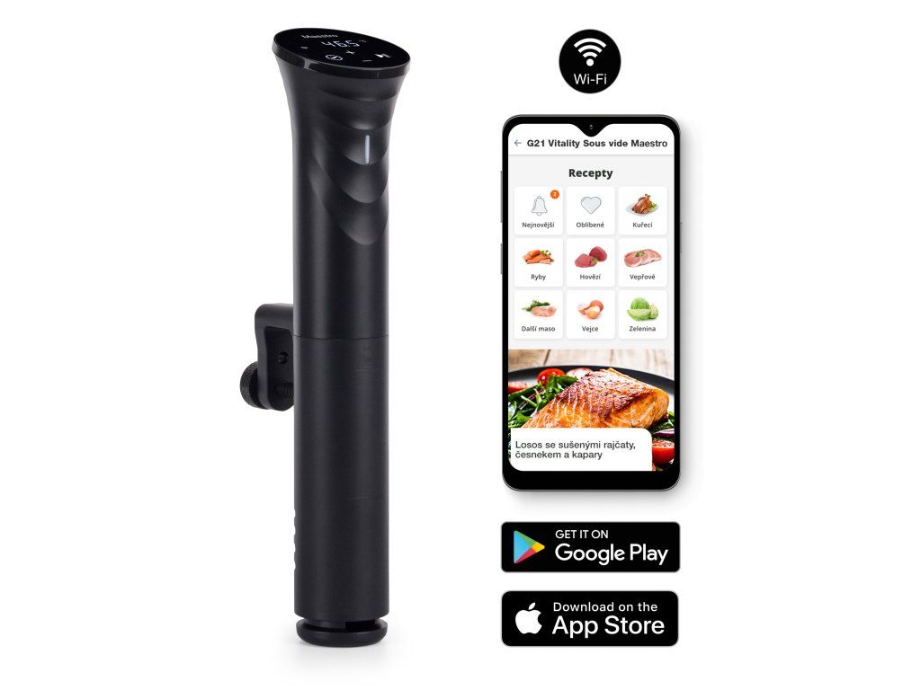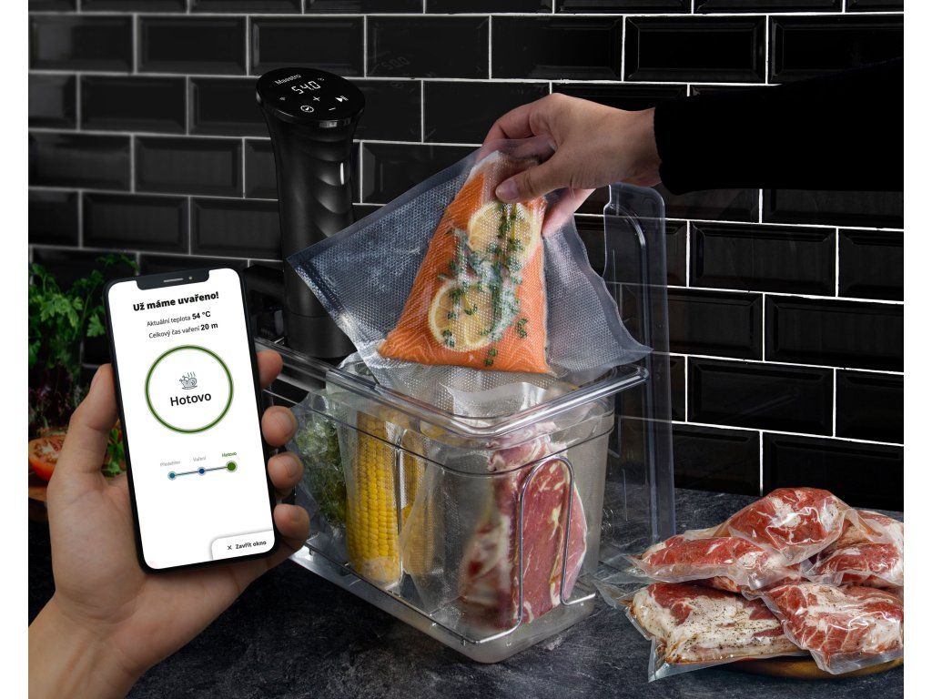 Příklad: Vložíte do hrnce s vodou zavakuované suroviny a odejdete do práce nebo na výlet. Cestou si na mobilu zvolíte recept a pošlete přes apku pokyn do sous-vide G21 Maestro. Po návratu můžete prostírat.
