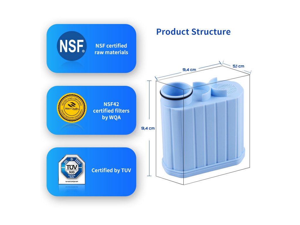 Filtr je vyroben z potravinářských materiálů s certifikací EC-1935/2016, ROHS, REACH, BPA-free, TUV a Australian Water Mark.