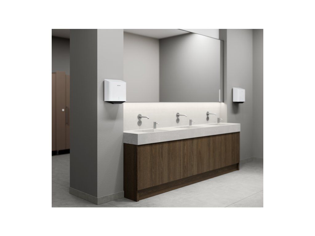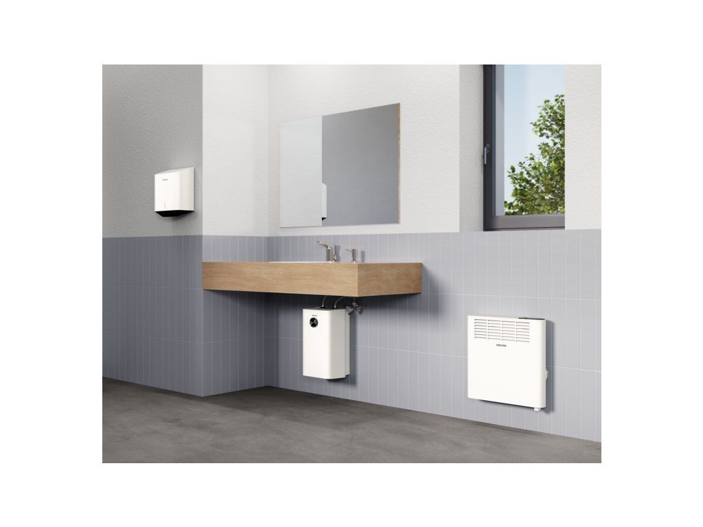 Komfort a hygiena – s tímto osoušečem rukou v umývárnách se bez nich už nikdy nebudete muset obejít. Přístroj s bílým plastovým krytem dokonale splyne s okolím a osušení rukou hostů nebo zaměstnanců trvá méně než dvanáct sekund. Ideální, pokud chcete splnit vysoké požadavky na sanitární prostory v gastronomii, komerčních nebo veřejných budovách. Pokud použijete také funkci vytápění, zvýšíte tím komfort. Bez vytápění naopak ušetříte energii. V tichém režimu pracuje přístroj tišeji, což je výhodou ve školách nebo kancelářích.