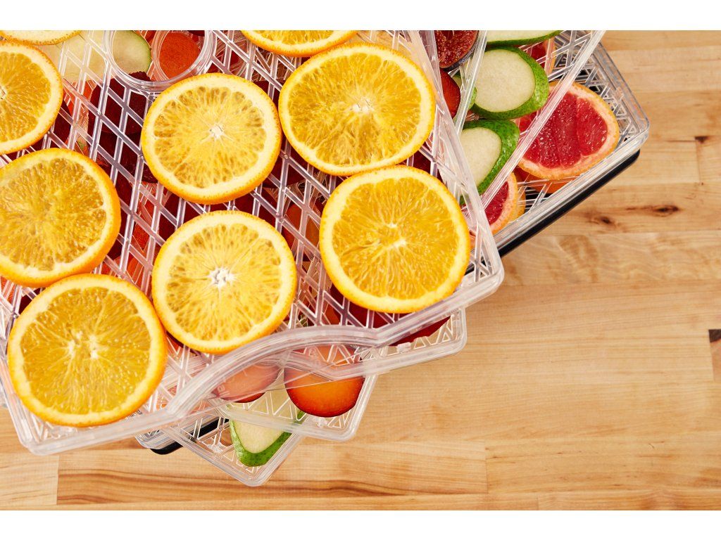 Usazení ventilátoru, výborně řešená sušící plata a navíc možnost jejich výškového nastavení garantuje rovnoměrné a rychlé sušení. Materiál sušících plat vám zase dopřeje jednoduché vyndání usušeného ovoce i zeleniny. Suroviny k platům nepřilnou, snadno je proto oddělíte.
