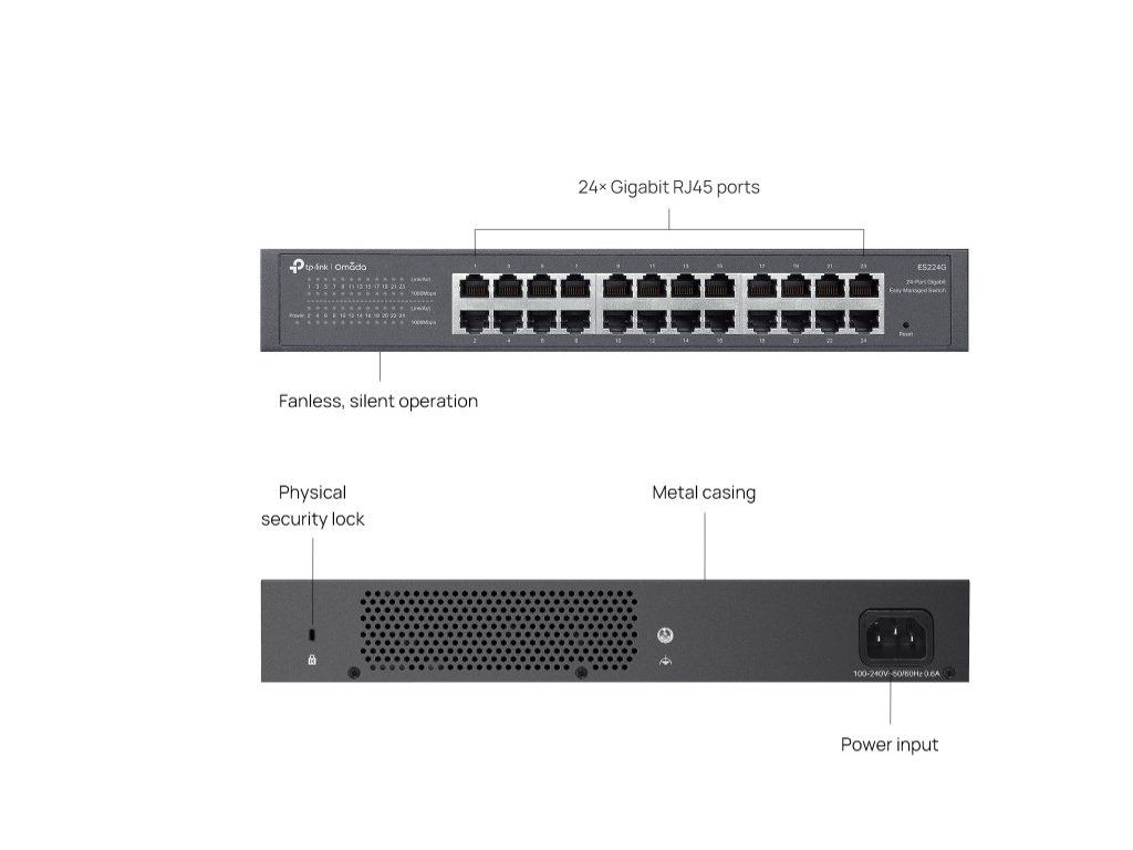 Switch ES224G je navržený pro profesionální, ale zároveň nenáročný provoz. Využijete jej jak v dohledových systémech, tak i v běžném firemním prostředí. Díky plug-and-play funkci je ihned připravený k použití, zatímco centralizovaná správa přes Omada SDN umožňuje pokročilé nastavení a monitoring. Bezventilátorová konstrukce zajistí zcela tichý chod a díky robustnímu kovovému tělu jej snadno namontujete do racku i na stůl.