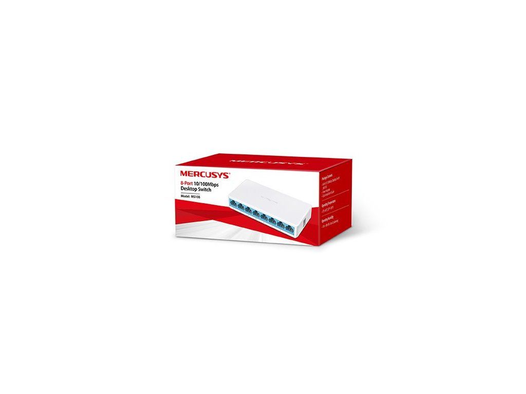 Switch MS108 Mercusys je napájen externím adaptérem (5 V / 0,6 A). Jednoduchý 8portový mini switch od značky TP-Link rychle rozvine kabelovou síť rychlostí portů 10 / 100 Mbps. Osm portů RJ45 s automatickým vyjednáváním podporuje automatický MDI / MDIX.Kompaktní konstrukce a elegantní design pro flexibilní uspořádání kabelové sítě. Není vyžadována žádná konfigurace díky nastavení Plug and Play. Stačí připojit přepínač k televizoru nebo počítači pomocí kabelu Ethernet a okamžitě rozšířit kabelovou síť.