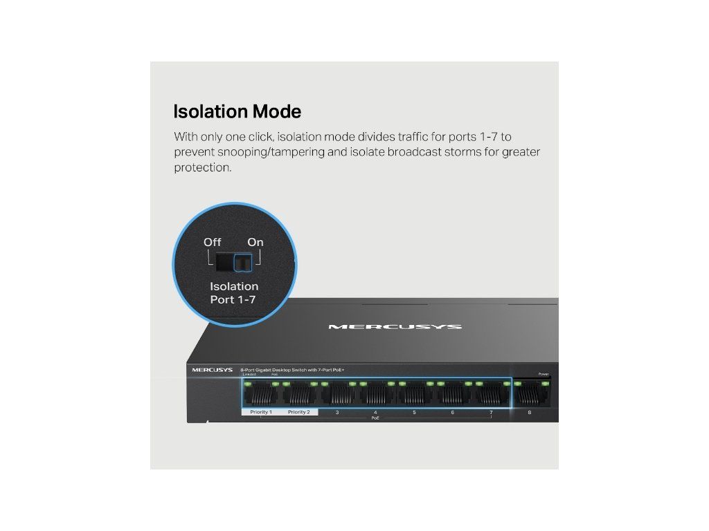 Zařízení poskytuje v režimu Extend dosah přenosu PoE až 250 metrů. V režimu izolace si zase jediným kliknutím můžete rozdělit provozní zátěž a přiřadit prioritu pro jednotlivé porty. Tím získáte potřebnou stabilitu a zabezpečíte své připojení proti neoprávněné manipulaci.