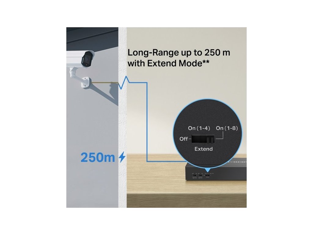Zařízení poskytuje v režimu Extend dosah přenosu PoE až 250 metrů. V režimu izolace si zase jediným kliknutím můžete rozdělit provozní zátěž, čímž si zajistíte bezpečné a stabilní připojení. Při zapnutí tohoto režimu máte k dispozici 2 Uplink porty. Jeden slouží pro připojení k internetu, druhý pro připojení k NVR.