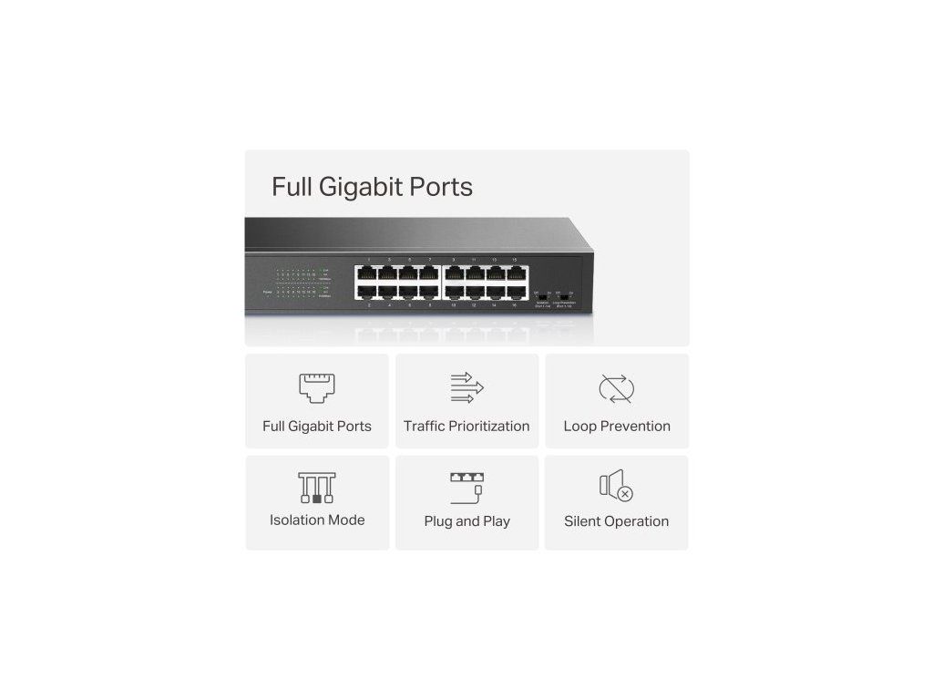 - Pokročilé funkce: 802.3X Flow Control, 802.1P/DSCP QoS, Loop Prevention (prevence smyček), Isolation (izolace portů)