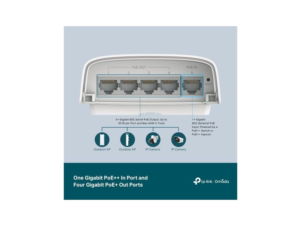 - Rozhraní: 1x 10/100/1000 Mbps RJ45 PoE In Port (spolupracuje s 802.3af/at/bt), 4x 10/100/1000 Mbps RJ45 PoE Out Port (spolupracuje s 802.3af/at PoE)