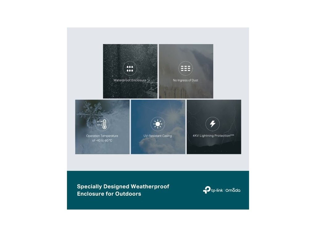 Switch TP-Link SG2005P-PD využijete ve venkovním prostředí. Je totiž vybavený krytím IP55, které ho chrání před povětrnostními vlivy. Jeho pouzdro odolá vodě, prachu, UV záření a dokonce je vybavené ochranou před bleskem (4kV).