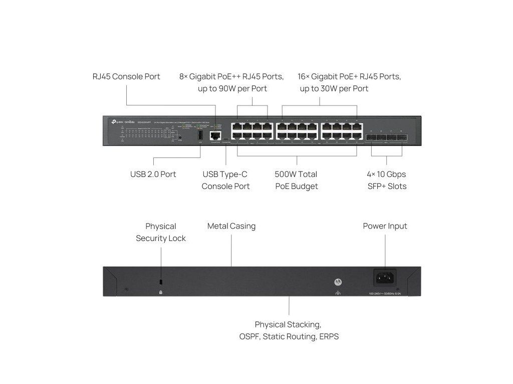 Switch nabízí 24 gigabitových RJ45 portů, z toho 8 portů podporuje PoE++ s výkonem až 90 W a 16 portů PoE+ až 30 W. Díky celkovému PoE rozpočtu 500 W snadno napájí bezdrátové přístupové body, IP kamery nebo VoIP telefony. Funkce Fast PoE a Perpetual PoE zajišťují napájení i během restartu switche.