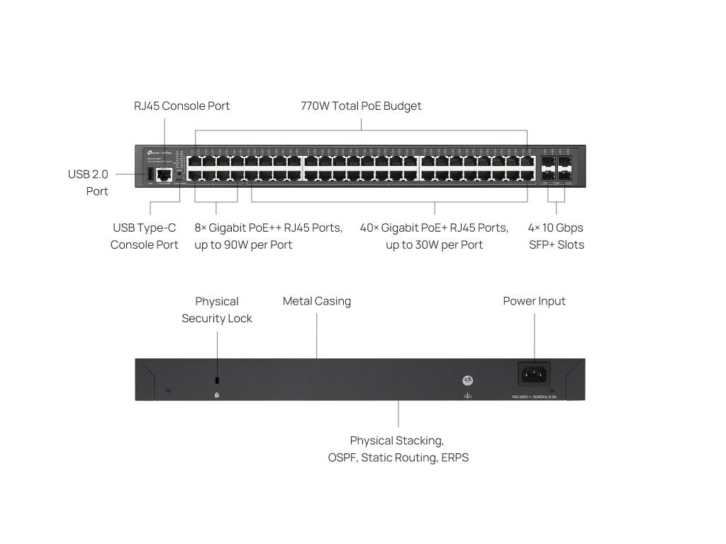 Spravovaný L3 PoE++ switch TP-Link SG5452XMPP je navržen pro vysokou hustotu připojení, maximální napájecí výkon a robustní správu v podnikových sítích i u ISP. Nabízí 48 gigabitových PoE portů (8× PoE++ až 90 W a 40× PoE+ až 30 W), 4× 10Gbps SFP+ uplinky, 770W PoE rozpočet a fyzické stohování až 4 jednotek. Podporuje Perpetual PoE, Fast PoE, pokročilé směrování L3, ochranu v kruhové topologii (ERPS) a centralizovanou správu přes Omada SDN.