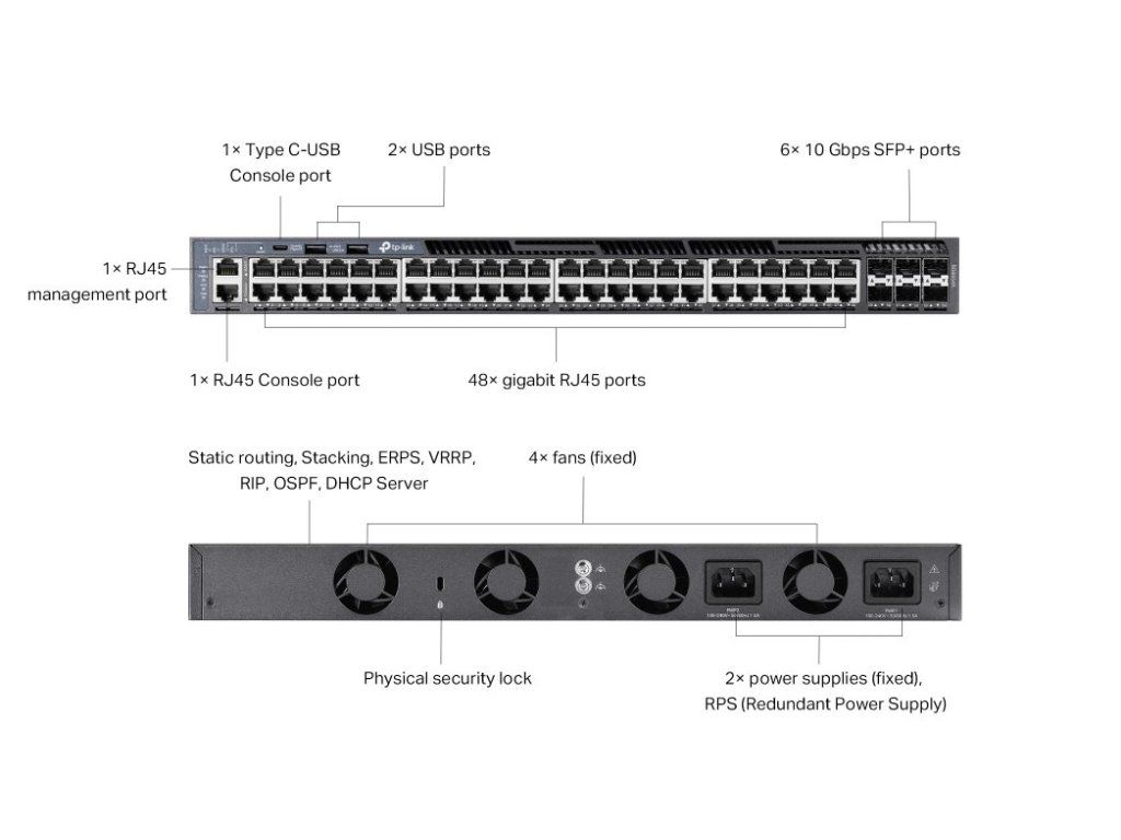 - Rozhraní: 48x 10/100/1000 Mbps RJ45 Port, 6x 10G SFP+ Slot, 2x USB 2.0 Port, 1x RJ45 Console Port, 1x USB Type-C Console Port, 1x RJ45 Management Port