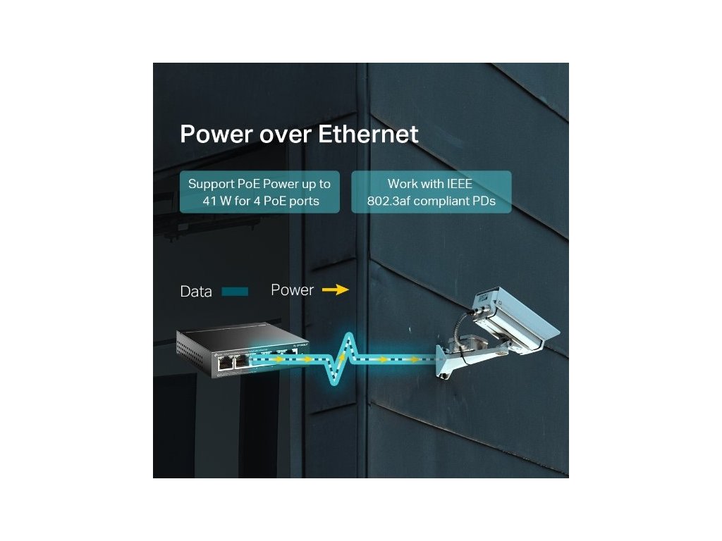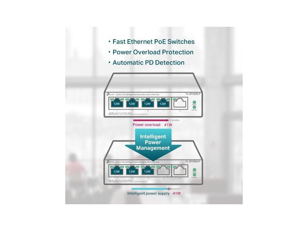 Switch TL-SF1005LP je vybaven 5 porty s rychlostmi přenosu dat 10/100 MB/s, kdy 4 z nich nabízí napájení pomocí PoE. Dokáže tak automaticky detekovat a napájet jakákoliv zařízení PD (Powered Devices), která splňují protokol IEEE 802.3af. V tomto provedení je elektrické napájení přenášeno společně s daty přes stejný kabel, což vám umožňuje rozšířit vaši síť i do míst, kde nejsou elektrické přípojky nebo zásuvky.
