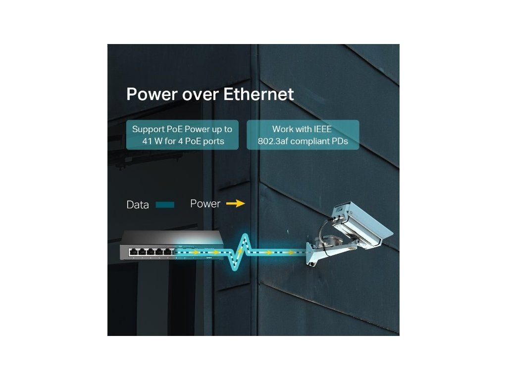 Switch TL-SF1008LP je vybaven 8 porty s rychlostmi přenosu dat 10/100 MB/s, kdy 4 z nich nabízí napájení pomocí PoE. Dokáže tak automaticky detekovat a napájet jakákoliv zařízení PD (Powered Devices), která splňují protokol IEEE 802.3af. V tomto provedení je elektrické napájení přenášeno společně s daty přes stejný kabel, což vám umožňuje rozšířit vaši síť i do míst, kde nejsou elektrické přípojky nebo zásuvky.