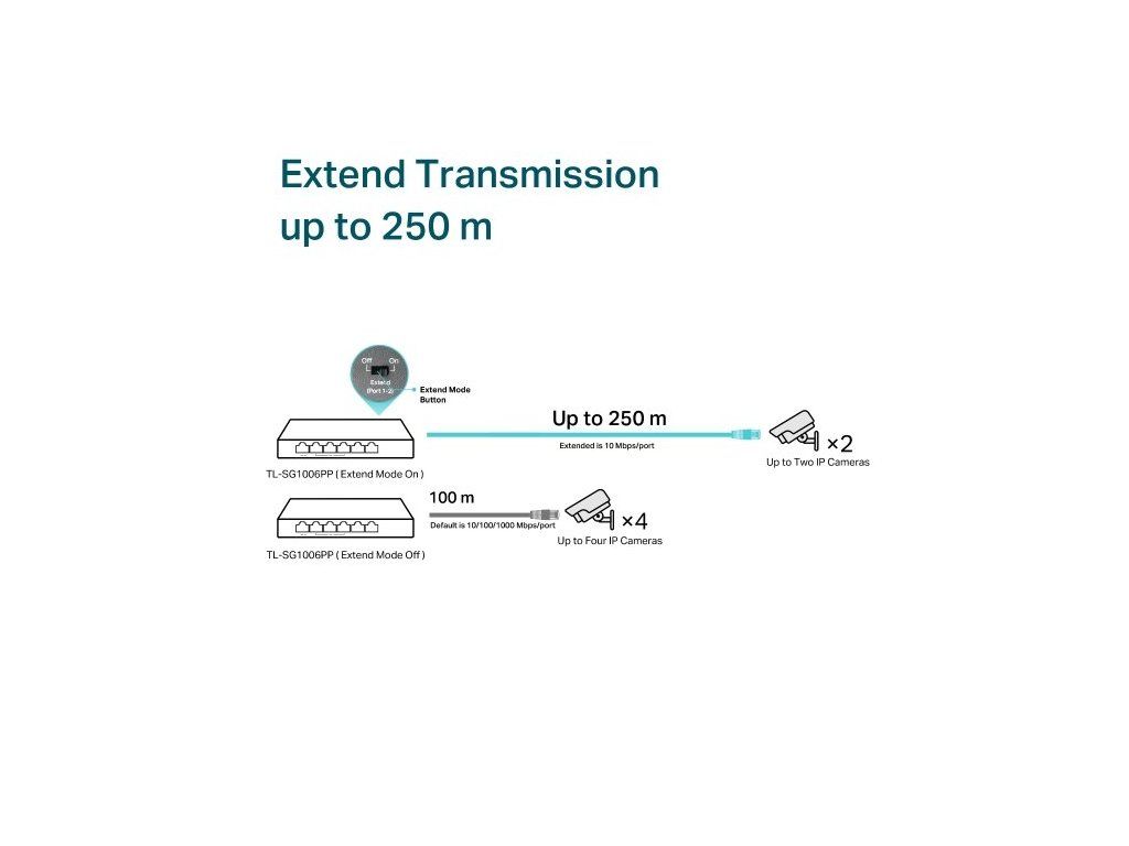 Switch TP-Link přenáší data a napájí zařízení v rozšířeném režimu až na vzdálenost 250 m. Tento rozsah využijete převážně pro IP kamery, které máte umístěné na různých místech pozemku. Rychlost portů v tomto režimu se sníží na 10 Mbps. Záleží také na spotřebě zařízení, která napájíte prostřednictvím PoE, a kvalitě a typu kabelu.