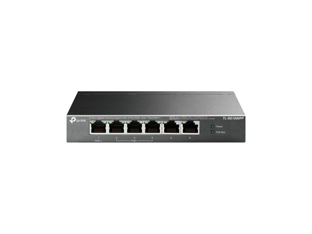 Switch TP-Link TL-SG1006PP je vybavený celkem šesti 10/100/1000Mbps RJ45 porty. Z toho má 1 PoE++ port a 3 PoE+ porty. Switch spolupracuje se standardem IEEE 802.3af/at/bt (kompatibilní s PD). Pomocí kabelu současně přenášíte data a napájíte zařízení. Port 1 (standard 802.3af/at/bt PoE++) poskytuje výkon až 60 W. Porty 2–4 (standard 802.3af/at PoE+) mají výkon až 30 W na každém PoE+ portu. Celkový výkon na napájení PoE dosahuje hodnoty 64 W. K přepínači připojíte IP kamery, přístupové body, IP telefony, počítače, tiskárny a další podobná kompatibilní zařízení.