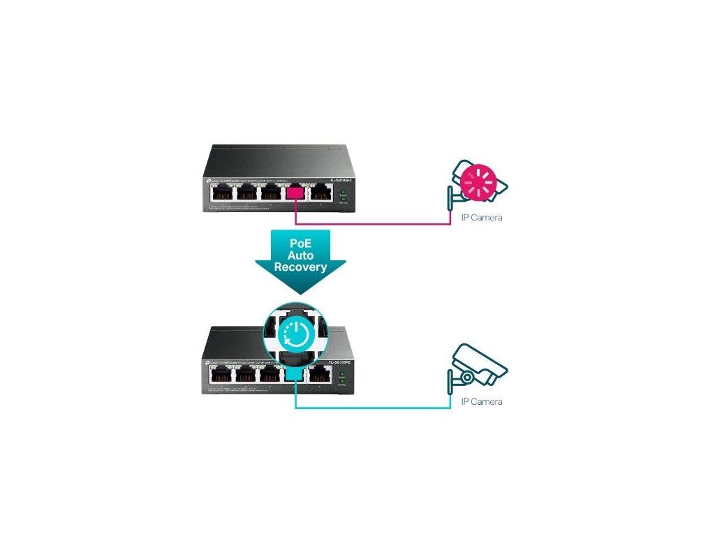 Gigabitový Plug-and-Play switch TP-Link TL-SG105PE má celkem 5 LAN portů, z čehož 4 porty podporují PoE+ napájení (802.3af/at) s celkovým budgetem 65 W (30 W/port). PoE napájení vám značně ulehčí rozšíření vaší domácí i firemní sítě a ušetří vám i náklady a čas. V tomto provedení je elektrické napájení přenášeno společně s daty přes stejný kabel, což vám umožňuje rozšířit vaši síť i do míst, kde nejsou elektrické přípojky nebo zásuvky. Přepínač je tedy schopný připojit a napájet až 4 zařízení, jako jsou kupříkladu bezdrátové access pointy (AP), IP kamery a telefony či senzory pro automatizaci budov.