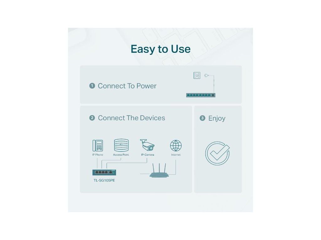 - Celokovový plug-and-play switch TP-Link TL-SG105PE nabízí dokonalé řešení pro vaší domácí i firemní síť bez nutnosti konfigurace a instalace