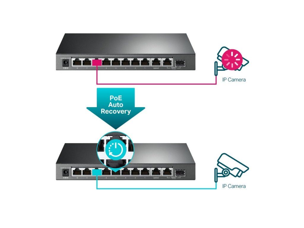 Tento PoE přepínač také dokáže obnovit PD zařízení, jako jsou IP kamery a AP, když jsou offline nebo nereagují, což zaručuje stabilní provoz zařízení i bez nutnosti ručního monitorování a restartování. Navíc PoE odpojí napájení na portu s nižší prioritou, čímž nabídne dostatek výkonu pro zařízení s vyšší prioritou a nedojde tak k přetížení switche.