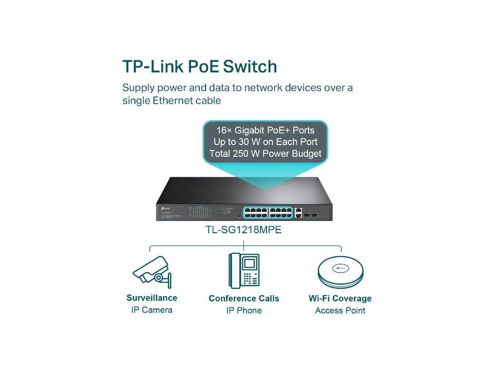 TL-SG1218MPE vyhovuje standardu 802.3af / at PoE + a podporuje až 30W napájení na každém portu PoE. Celkový vysoký rozpočet na napájení PoE je až 192 W pro 16 portů PoE, takže je ideální pro sledovací systémy v malých a středních firmách. Switch dokáže přenášet data z videokamer, přístupových bodů, IP telefonů a dalších zařízení a zároveň je i napájet. Odpadá tak nutnost vést samostatné kabely pro napájení připojených zařízení.