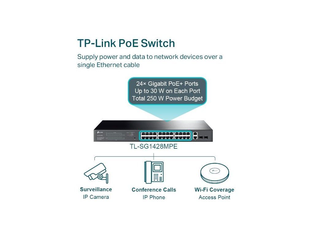 TL-SG1428MPE vyhovuje standardu 802.3af / at PoE + a podporuje až 30W napájení na každém portu PoE. Celkový vysoký rozpočet na napájení PoE je až 250 W pro 26 portů PoE, takže je ideální pro sledovací systémy v malých a středních firmách. Switch dokáže přenášet data z videokamer, přístupových bodů, IP telefonů a dalších zařízení a zároveň je i napájet. Odpadá tak nutnost vést samostatné kabely pro napájení připojených zařízení.