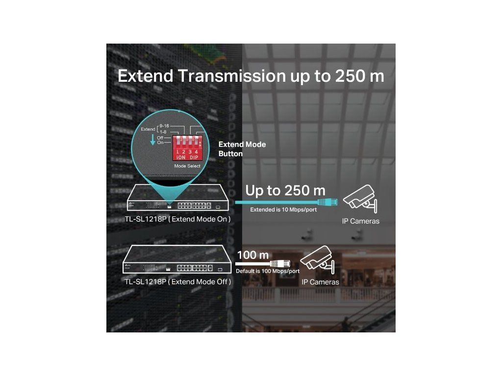 Další 2 porty jsou gigabitové, sloužící jako uplink do sítě z čehož poslední port je jako combo port s gigabitovým SFP portem. Switch má na portech 1-16 možnost přepnutí na Extended Mode, což pomůže například při instalaci kamer, kdy dosah ze 100m je rozšířen až na 250m. Při této funkci je link ponížen na 10Mbps.