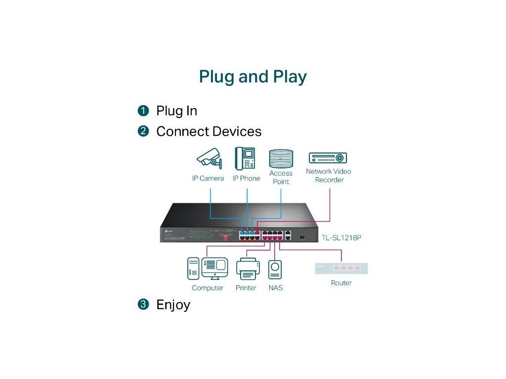 TL-SL1218P je nemanagovatelný rackmount PoE switch s 18 porty a jedním combo SFP. Prvních 16 portů mají rychlost 10/100Mbps a podporují 802.3af/at PoE s maximální spotřebou 30W/port a celkovým PoE budgetem 150W.
