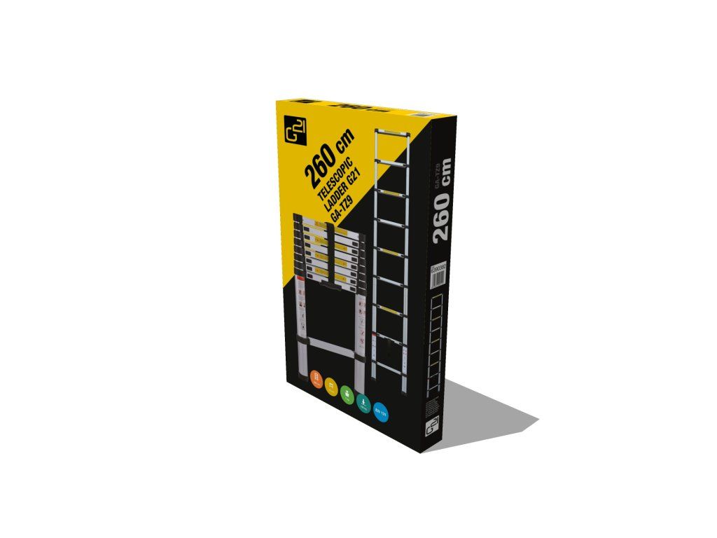 Teleskopický žebřík G21 GA-TZ9-2,6M původně vyvinutý pro profesionály, je špičkový model, který se vyznačuje dostatečně pevnou a odolnou konstrukcí, díky systému duralových profilů. Na jeho konstrukci byly využity lehké hliníkové materiály, které snižují jeho celkovou hmotnost a zároveň zabezpečují složení žebříku do minimální úložné velikosti.
