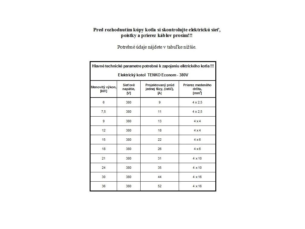 Produktová řada pracující v trojfázové síti 380 V se skládá z 6kW, 7,5kW, 9KW, 12kW, 15kW, 18kW, 21kW, 24kW, 30kW kotlů se třemi topnými stupni.