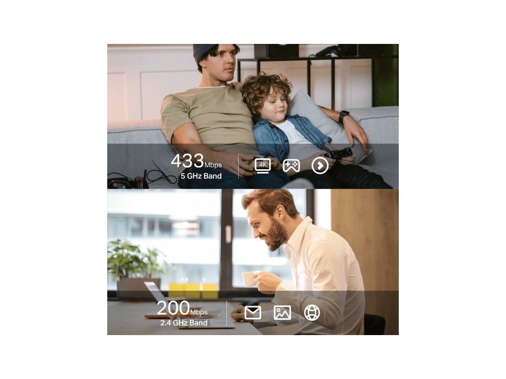 Pomocí USB klienta přijímáte signály WiFi na 2 samostatných pásmech. Rychlost sítě dosahuje až 600 Mb/s (200 Mb/s na 2,4 GHz pásmu a 433 Mb/s na 5 GHz pásmu). Frekvence 5 GHz se skvěle hodí pro streamování videa v HD kvalitě a hraní online her bez zpoždění. Frekvenci 2,4 GHz využijete pro běžné používání – surfování na internetu.