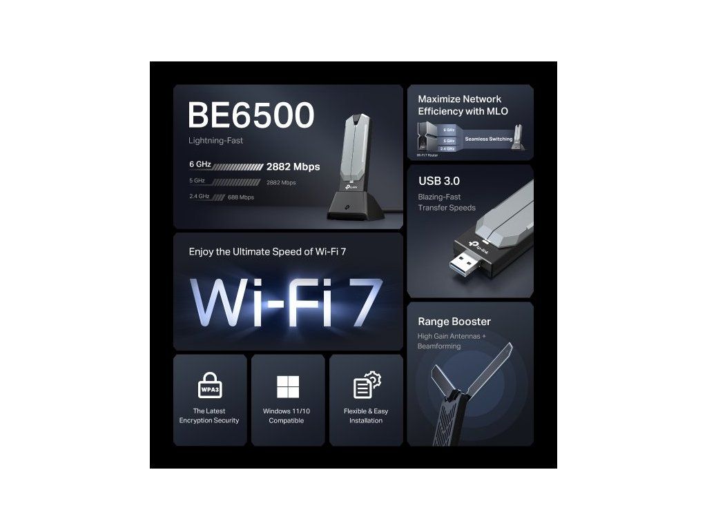 USB klient TP-Link Archer TBE400UH vám zajistí silné třípásmové Wi-Fi 7 připojení. V pásmu 6 GHz a 5 GHz vám poskytne rychlost připojení až 2 882 Mb/s a v pásmu 2,4 GHz až 688 Mb/s. K dispozici máte rozhraní USB 3.0, které zajistí vyšší rychlosti přenosů. Streamujte videa v HD kvalitě, hrajte online hry se svými přáteli nebo si jen prohlížejte informace na webu. Zařízení podporuje operační systém Windows 10 a 11.