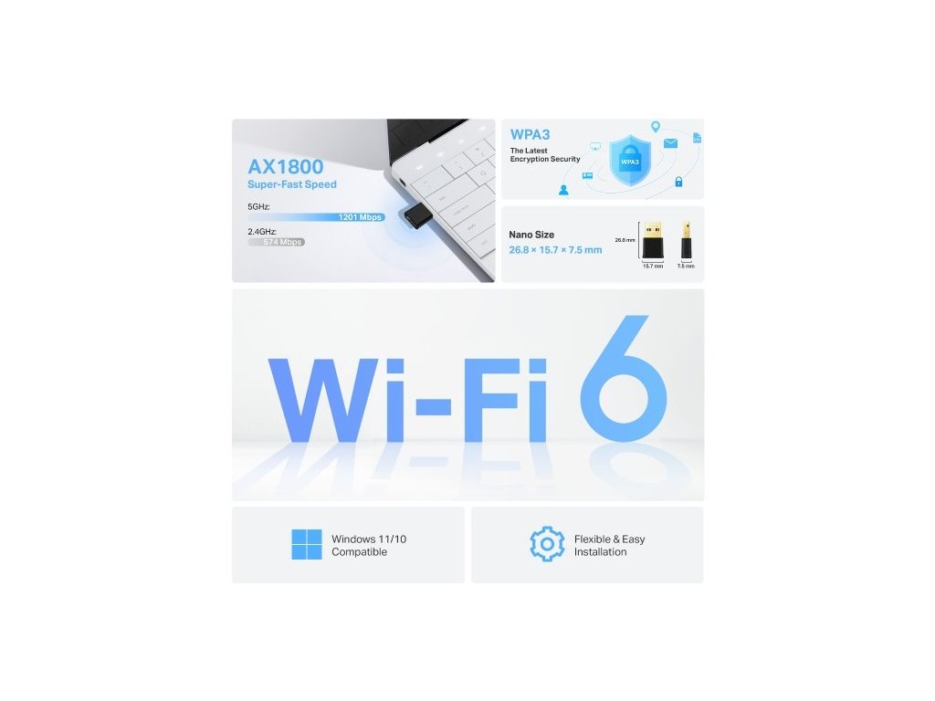 USB klient podporuje připojení ke standardu WiFi 6. Snižuje zpoždění sítě a zkracuje dobu pro načítání webových stránek. Technologie MU-MIMO a OFDMA ještě více zvyšují efektivitu WiFi sítě. Připojíte k ní větší množství zařízení, aniž by došlo k nepříjemným výpadkům. USB adaptér je navíc skvěle zabezpečený. WPA3 chrání vaše osobní hesla.