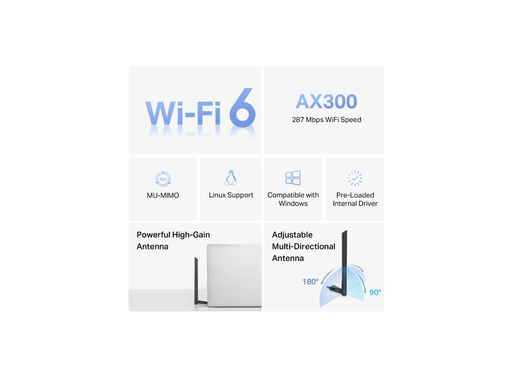 USB klient Wi-Fi 6 nabízí vysokou přenosovou rychlost až 287 Mb/s na frekvenci 2,4 GHz a přináší širší pokrytí díky výkonné externí anténě. Interní ovladač pro snadnou instalaci, podpora Win/Linux.