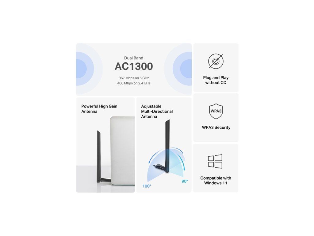 USB klient TP-Link Mercusys MA30H vám zajistí silné dvoupásmové Wi-Fi připojení. V pásmu 5 GHz vám poskytne rychlost připojení až 867 Mb/s a v pásmu 2,4 GHz až 400 Mb/s. Streamujte videa v HD kvalitě, hrajte online hry se svými přáteli nebo si jen prohlížejte informace na webu.