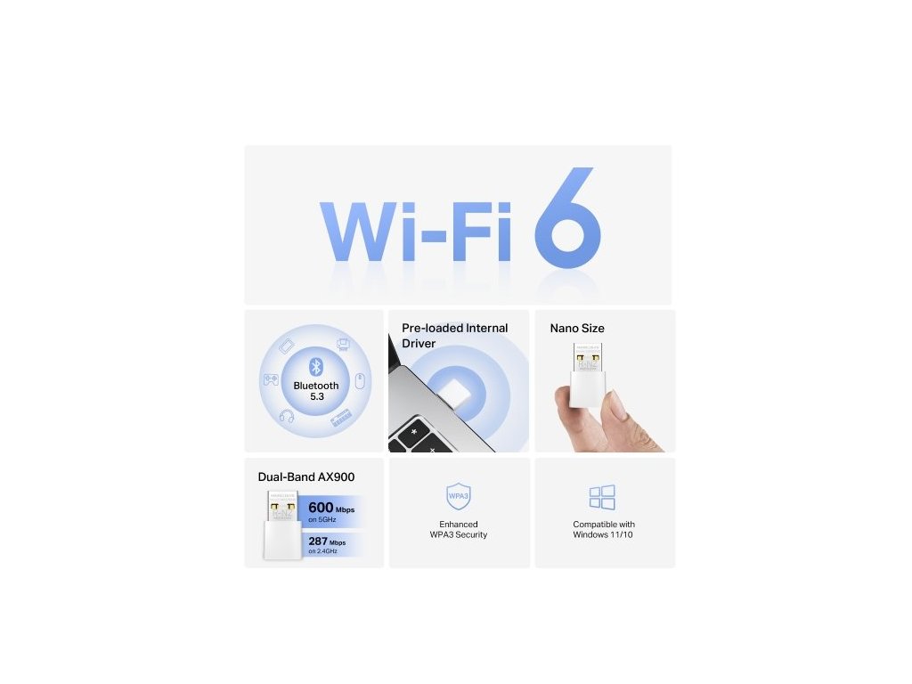 Ultrakompaktní USB adaptér pro Wi-Fi 6 AX900 a Bluetooth 5.3. WPA3, nano velikost, instalace Plug and Play, USB 2.0,. Kompatibilní s OS Windows 10/11.