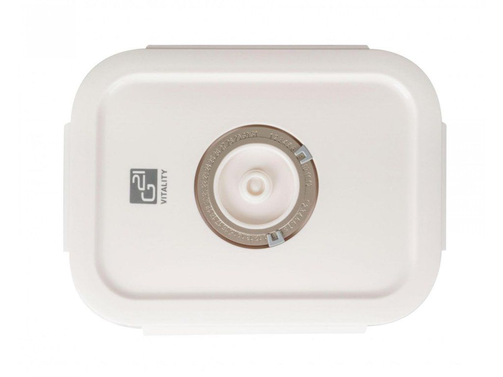 Plastové víko je vybaveno vakuovacím ventilem a praktickým nastavováním data. Budete tak vědět, kdy byly potraviny vakuovány nebo do kdy se mají spotřebovat. Ventil uprostřed víka lze jemně zmáčknout pro snadné uvolnění vakua.