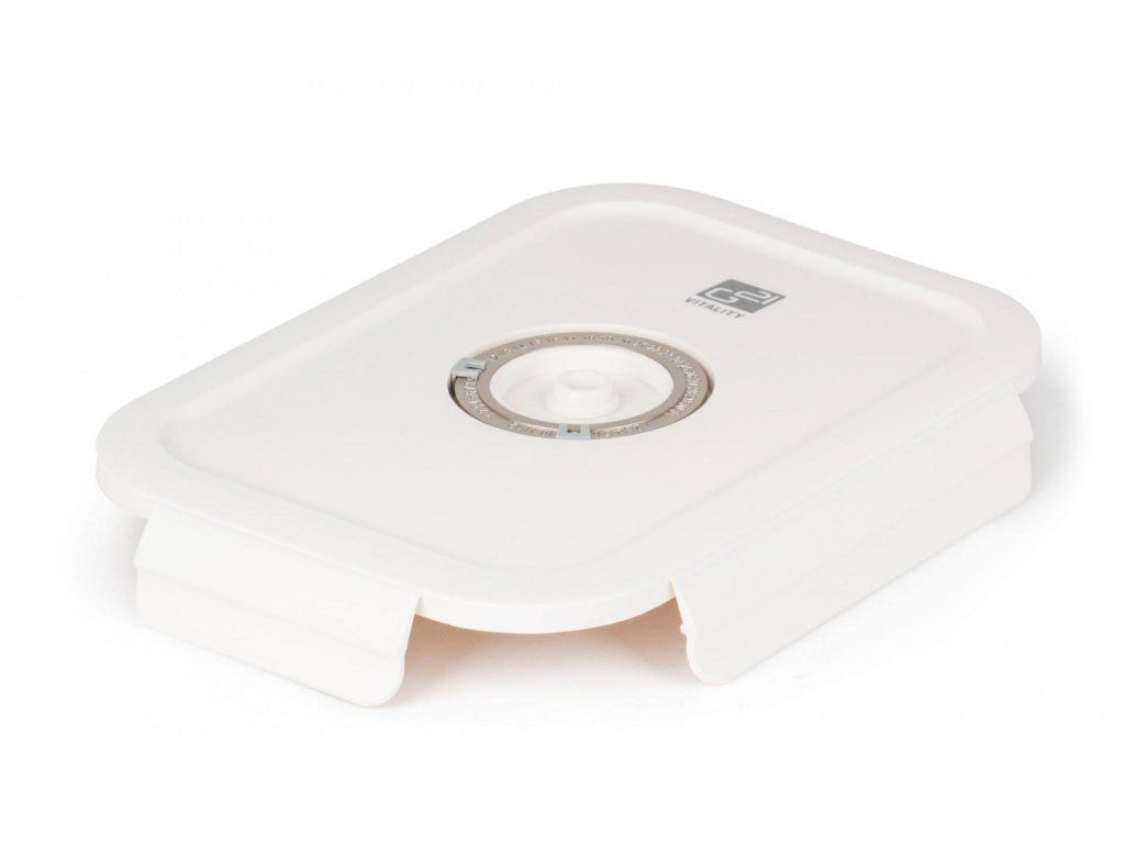 Plastové víko je vybaveno vakuovacím ventilem a praktickým nastavováním data. Budete tak vědět, kdy byly potraviny vakuovány nebo do kdy se mají spotřebovat. Ventil uprostřed víka lze jemně zmáčknout pro snadné uvolnění vakua.