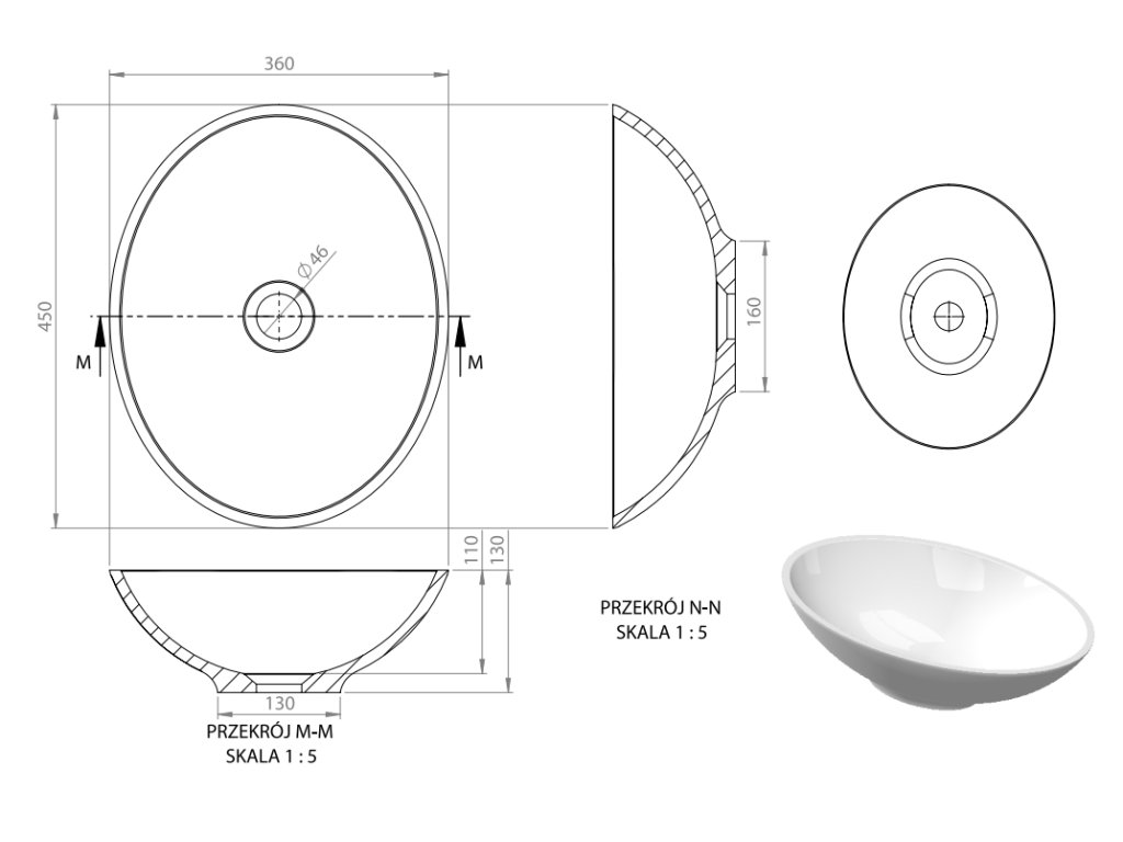 Vayer Lyra 45 umyvadlo na desku, litý mramor, VAY-LY