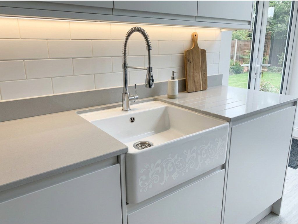 - bílý keramický dřez s originálním broušeným White Pearl Décor na přední straně