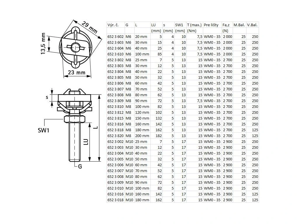 | Výr. č. | G | L | LU (mm) | s (mm) | SW1 (mm) | T(inst.) (Nm) | Pro lišty | Fa,z (N) | Fa,z (kg) | M.Bal. | V.Bal. | Sj. | Váha (g) |