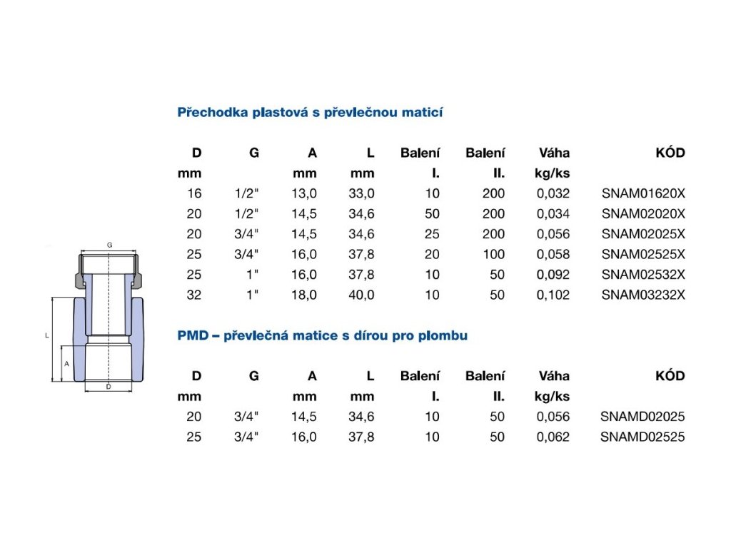Plastová přechodka s kovovou převlečnou maticí, určena pro rozebíratelné závitové spojení. Používá se pro pitnou a studenou vodu. Nelze ji ale použít pro vytápění či teplou vodu.