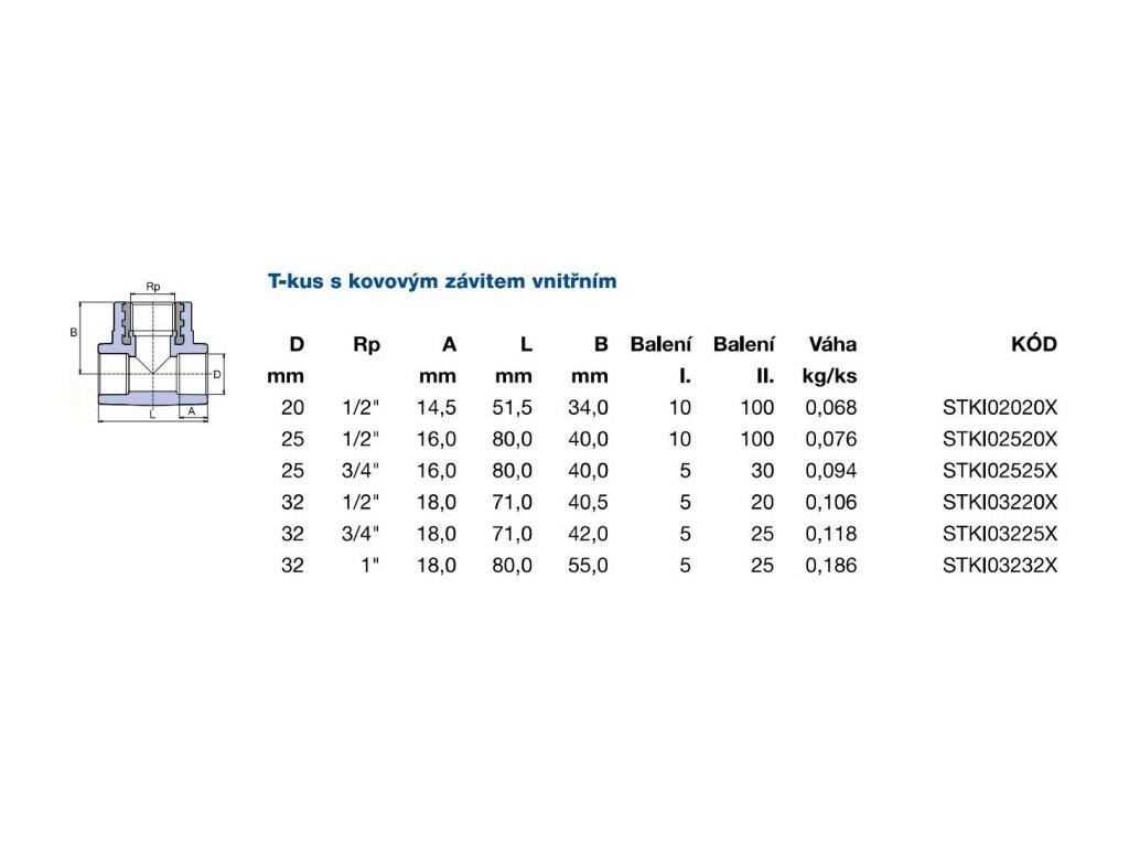Plastový T-kus s vnitřním kovovým závitem je určen pro závitové spojení v místě dělení trasy. Na potrubní systém se napojuje svářením, těsnost závitového spoje je zajištěna např. teflonovou páskou nebo nití. Tento t-kus můžete použít pro rozvody pitné, studené a teplé vody, vytápění a rozvody stlačeného vzduchu.