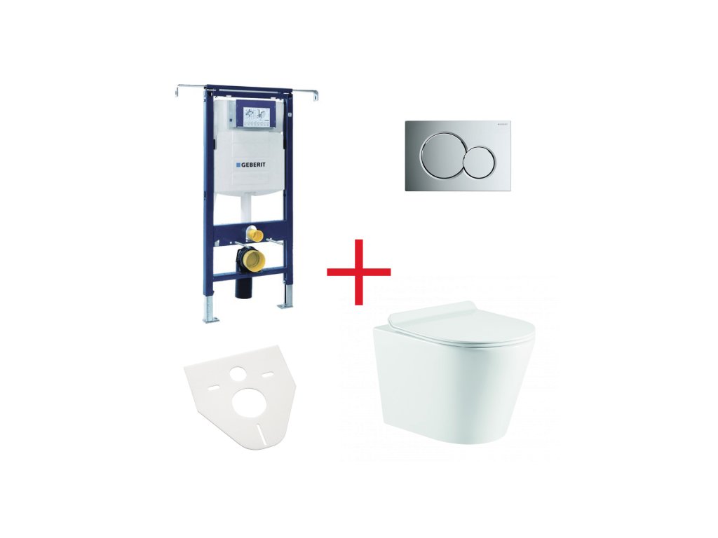 Kompletní WC set obsahující: závěsné WC OVALE BASSO s moderním RIMLESS systémem včetně SLIM sedátka se systémem SOFT-CLOSE, předstěnový modul, podložku, splachovací tlačítko GEBERIT Sigma 01.